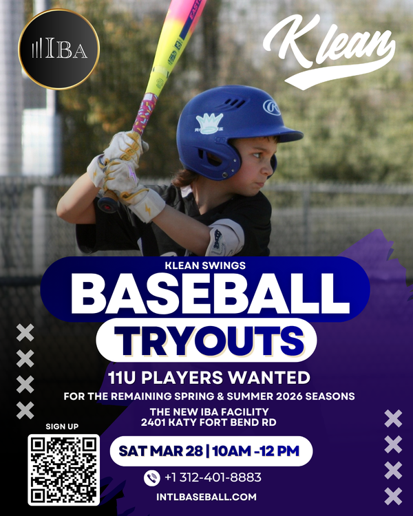 Klean Swings Baseball Tryouts are now open for dedicated athletes ready to train, compete, and grow within the IBA environment. Hosted at The New IBA Facility, 2401 Katy Fort Bend Rd, these tryouts are designed for players who want to be part of a serious development program built on strong fundamentals, structured coaching, and competitive baseball.